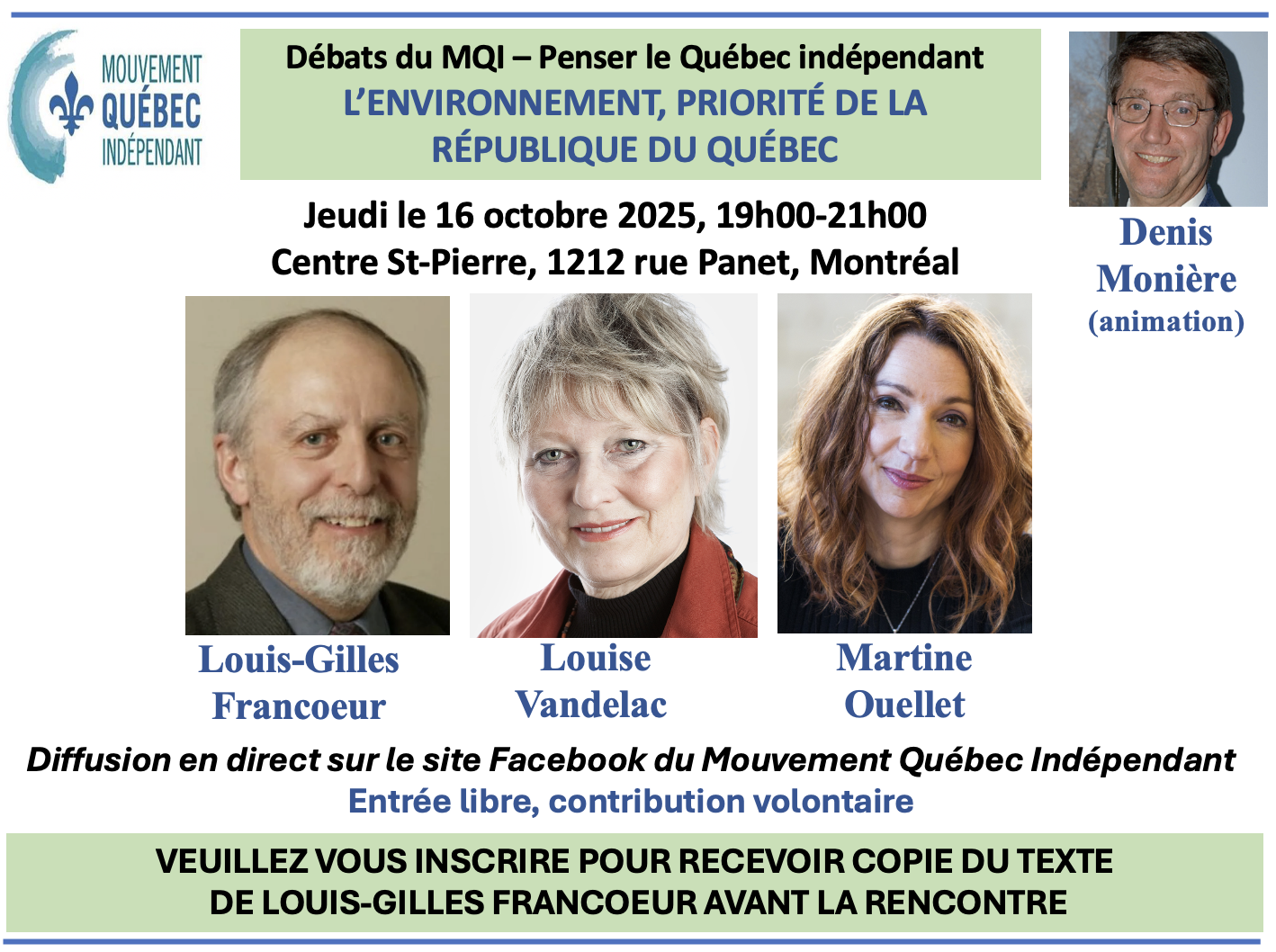 En collaboration avec la revue L'action Nationale, le Mouvement Québec Indépendant réalise cette année une série de débats sur différents domaines dans la perspective de l’indépendance du Québec. Dans ce neuvième dossier du projet Penser le Québec indépendant, publié dans la revue de mai-juin 2025, le journaliste et écologiste Louis-Gilles Francoeur vise à amorcer un débat de fond sur l’environnement, une mission étatique vitale pour l’avenir du Québec et de la planète. En récupérant d’importants pouvoirs actuellement dévolus au gouvernement canadien, le Québec pourra revoir de fond en comble sa politique environnementale. Louise Vandelac et Martine Ouellet apporteront leur expérience profonde et complémentaire à ce débat. Elles feront le point sur les défis à relever en environnement et pour la protection du climat dans une perspective qui devra mobiliser l’ensemble des fonctions de la future République du Québec.