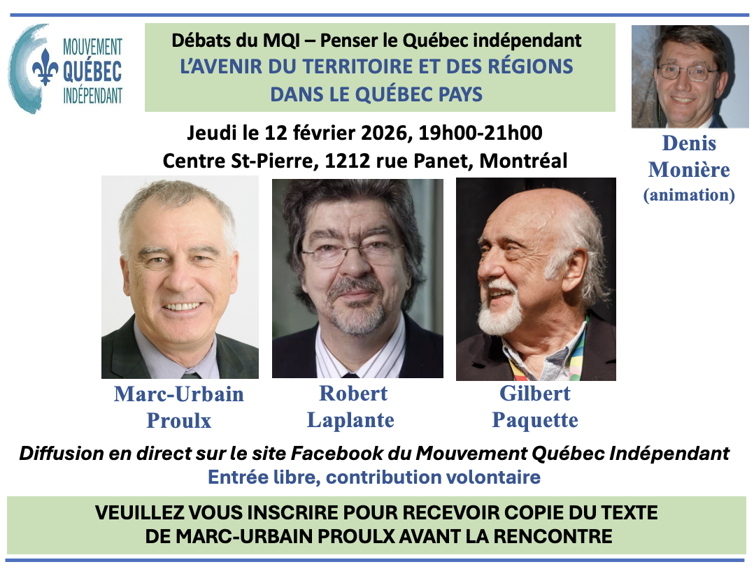 En collaboration avec la revue L'action Nationale, le Mouvement Québec Indépendant reprend en 2026 sa série de débats Penser le Québec indépendant. Dans ce dixième débat du projet, le spécialiste du développement régional, Marc-Urbain Proulx présente d’abord une analyse de l’évolution du territoire du Québec et de ses six régions périphériques, examinant l’accessibilité aux territoires, la propriété des activités de production, les institutions territoriales, l’impact des technologies, les modalités du travail, et de la démographie. Il conclue par un examen des scénarios de développement pour 2050, dans la perspective d’un Québec indépendant. La mission de l’État québécois, pleinement responsable de ses territoires s’avère de plus en plus incontournable.